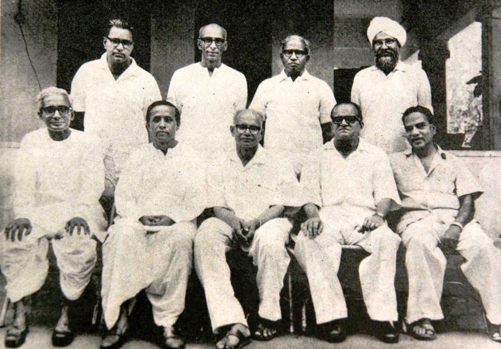 দাঁড়িয়ে রয়েছেন (বাম দিক থেকে): ১. পি রামমূর্তি ২. এম বাসবপুন্নাইয়াহ ৩. ই এম এস নাম্বুদিরিপাদ ৪. এইচ কে এস সুরজিত