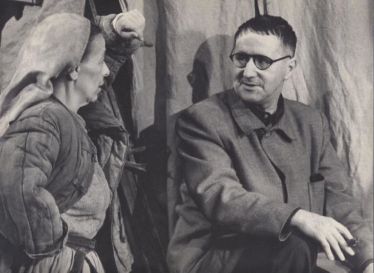 ’মাদার কারেজ অ্যান্ড হার চিলড্রেন’ নাটকের একটি দৃশ্য। (মাঝে) ব্রেশট ও (বাঁদিকে) তাঁর স্ত্রী হেলেনে ভাইগেল।