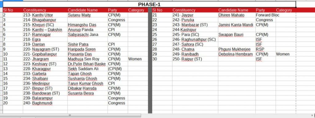 ক) প্রথম দফার নির্বাচনে প্রার্থী তালিকা (বামফ্রন্ট প্রার্থী) – নির্বাচনের তারিখঃ ২৬ মার্চ