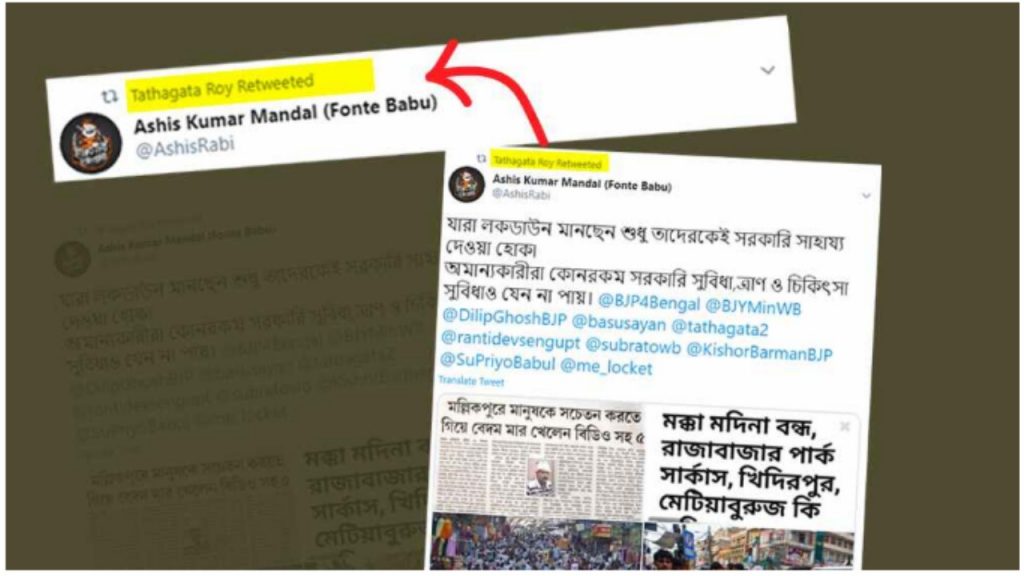 এমনকি মেঘালয়ের রাজ্যপাল এবং বিজেপি নেতা তথাগত রায়ও এধরণের ছবি ট্যুইট করে দাবি করেছেন যারা লকডাউন মানছেন না তাদের যেন সরকারি সাহায্য না দেওয়া হয়।