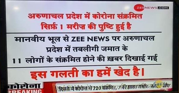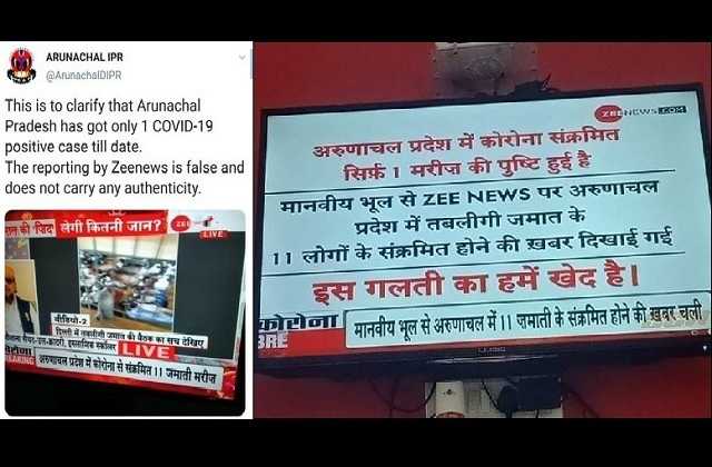 একইসাথে উল্লেখযোগ্য গতকাল, শুক্রবার (১০/০৩/২০২০) Zee News এর পক্ষ থেকে অরুণাচল প্রদেশে করোনা ভাইরাসের সংক্রমণ ছড়ানোর ব্যাপারে ভুয়ো খবর সম্প্রচার করা নিয়ে প্রকাশ্যে ক্ষমা চাওয়া হয়েছে।
