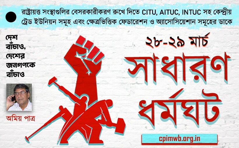 ২৭ মার্চ ২০২২ (রবিবার) ২৮-২৯ মার্চ দেশব্যাপী ধর্মঘট। বর্তমান দেশের রাজনৈতিক পরিস্থিতিতে এই ধর্মঘটের গুরুত্ব অপরিসীম। একদিকে নয়া উদার আর্থিক