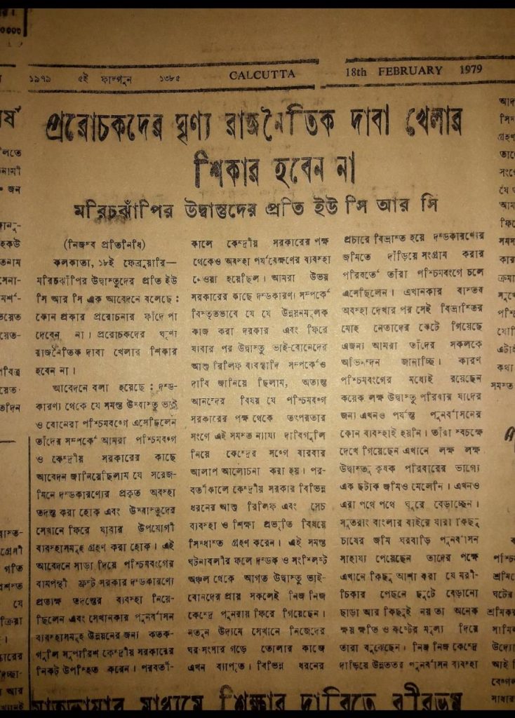 January 11, 2021 No comments কুৎসার আড়ালে,প্রকৃত সত্য(মরিচঝাঁপি-১) – অর্ণব ভট্টাচার্য রিফিউজি ক্যাম্পগুলিতে যে দুর্বিষহ অবস্থা ছিল তার অবসানের লক্ষ্যে,সরকারের দমন পীড়নের বিরুদ্ধে এবং বাস্তুহারাদের সুষ্ঠু পুনর্বাসনের দাবী নিয়ে ইউ সি আর সি লাগাতার আন্দোলন চালিয়ে যায়। সান্ধ্য গণশক্তি পত্রিকা (১৮ ফেব্রুয়ারি, ১৯৭৯) Spread the word
