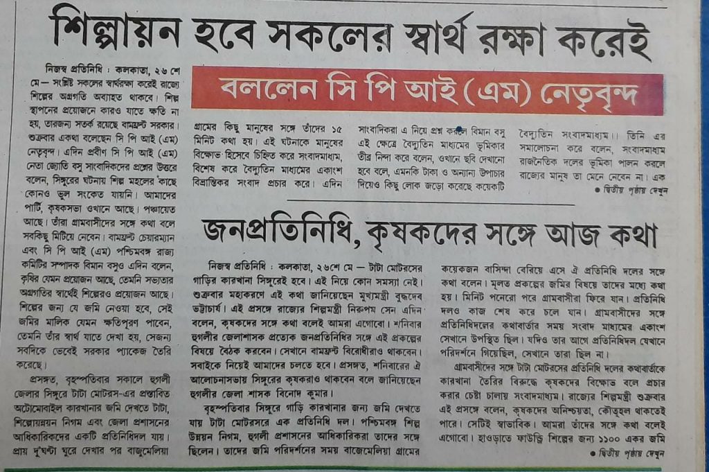 সিঙ্গুরে ইতিহাসের চাকা সাময়িকভাবে ঘুরিয়ে দিতে পেরেছিল তৃণমূল কংগ্রেস ও তার সহযোগীরা। বিকৃত উল্লাসে ধ্বংস করেছিল একটি নির্মীয়মান শিল্প কারখানা আর ধুলিস্যাৎ করেছিল বেকার যুবর আশা-আকাঙ্ক্ষা।ক্ষমতা দখলের লালসায় বামবিরোধী শক্তি কুৎসাকে হাতিয়ার করে যে ভয়ঙ্কর বিভ্রান্তি ছড়িয়েছিল মানুষের মনে তার জেরে বামপন্থীদের ওপর আস্থা হারিয়ে ফেলেছিলেন অনেক মানুষ।তবু সিঙ্গুরে শিল্প গড়ার প্রয়োজনীয়তা ও বামফ্রন্ট সরকারের যুক্তিপূর্ণ অবস্থান সম্পর্কে তখনও সন্দেহের অবকাশ ছিল না,এখনও নেই।