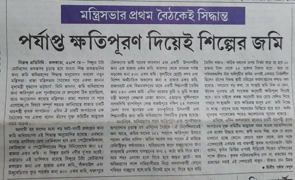 সিঙ্গুরে তৎকালীন জমি অধিগ্রহণ আইন অনুযায়ী যে ৯৯৭.১১ একর জমি অধিগ্রহণ করা হয়েছিল তার মধ্যে একফসলী জমিই প্রধান হলেও কিছু উর্বর জমিও ছিল,যার জন্য তৎকালীন বাজার দর একর পিছু ২লক্ষ টাকার বেশী ছিলনা।অথচ রাজ্য সরকার সেই জমির দাম দেয় একর পিছু ১২লক্ষ টাকা।আর অন্যান্য জমির ক্ষেত্রে ৮.৫ লক্ষ টাকা। জমির মালিক ও বর্গাদারদের যাতে আর্থিক ক্ষতি না হয় তার জন্য বামফ্রন্ট সরকার ক্ষতিপূরণের বিষয়টিতে যথেষ্ট গুরুত্ব দিয়েছিল। জমির দামের ২৫ শতাংশ বর্গাদারদের দেওয়া হয়।সিঙ্গুরে নির্মীয়মাণ মোটর গাড়ি কারখানাকে কেন্দ্র করে পরোক্ষ কর্মসংস্থানের এক বিপুল সম্ভাবনা দেখা দেয়।এই পরোক্ষ কর্মসংস্থানের ক্ষেত্রে ক্ষেতমজুরদের পরিকল্পিতভাবে যুক্ত করবার ভাবনা রাজ্য সরকারের ছিল। অধিগৃহীত জমির মধ্যে থেকেই ১০০ একর নির্দিষ্ট করা হয়েছিল যেখানে সেই সব স্থানীয় মানুষ যারা তাদের কৃষির সাথে যুক্ত জীবিকা হারিয়েছিলেন তাদের জন্য বিকল্প কর্মসংস্থানের পরিকল্পনা নেওয়া হয়। স্থানীয় যুবক-যুবতীদের অনেকেই প্রযুক্তিগত প্রশিক্ষণ পেয়েছিলেন এবং যারা প্রথাগত শিক্ষায় যথেষ্ট শিক্ষিত ছিলেন না তারাও নানারকম পরোক্ষ কর্মসংস্থানের সুযোগ পান। গাড়ি কারখানার নির্মাণ শুরু হলে এলাকায় পরিবহন ব্যবস্থা উন্নত হয়, নতুন হোটেল ইত্যাদি চালু হয়ে যায়। রাষ্ট্রায়ত্ত ব্যাংক এবং বেসরকারি ব্যাংকের ছ’টি এটিএম এই অঞ্চলে খোলা হয়েছিল। সব মিলিয়ে সিঙ্গুরে গাড়ি কারখানাকে কেন্দ্র করে সমাজের বিভিন্ন অংশের মানুষের আয়ের নতুন পথ প্রশস্ত হয়েছিল। শেষপর্যন্ত ষড়যন্ত্রের শিকার হয়ে গাড়ি কারখানা না হওয়ায় এক বিরাট সংখ্যক মানুষ তাদের অর্থনৈতিক উন্নতির সুযোগ থেকে বঞ্চিত হলেন।