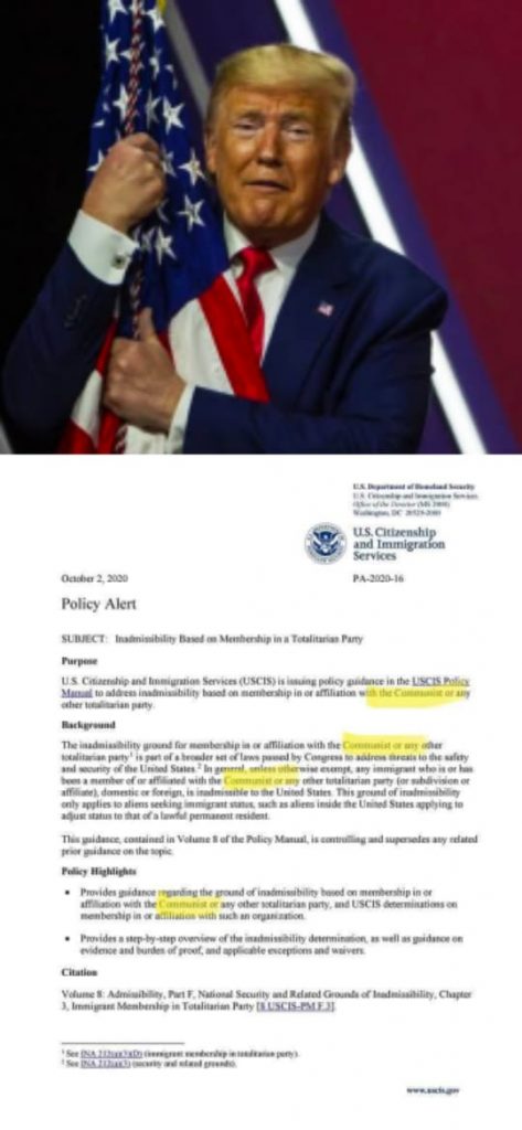 কমিউনিস্টদের ভূত দেখছেন ট্রাম্প। বিশ্বের কোনও দেশের কমিউনিস্ট পার্টির সদস্যরা আর আমেরিকায় ‘অভিবাসী’ হতে পারবেন না। সরাসরি এই নির্দেশিকা জারি করেছে ট্রাম্প প্রশাসন।